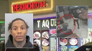 The would-be thief can be seen on surveillance video taking control of the taqueria and pointing a fake gun at customers as they take money from their wallets and place it on the tables and floor.